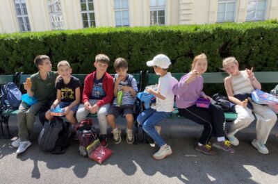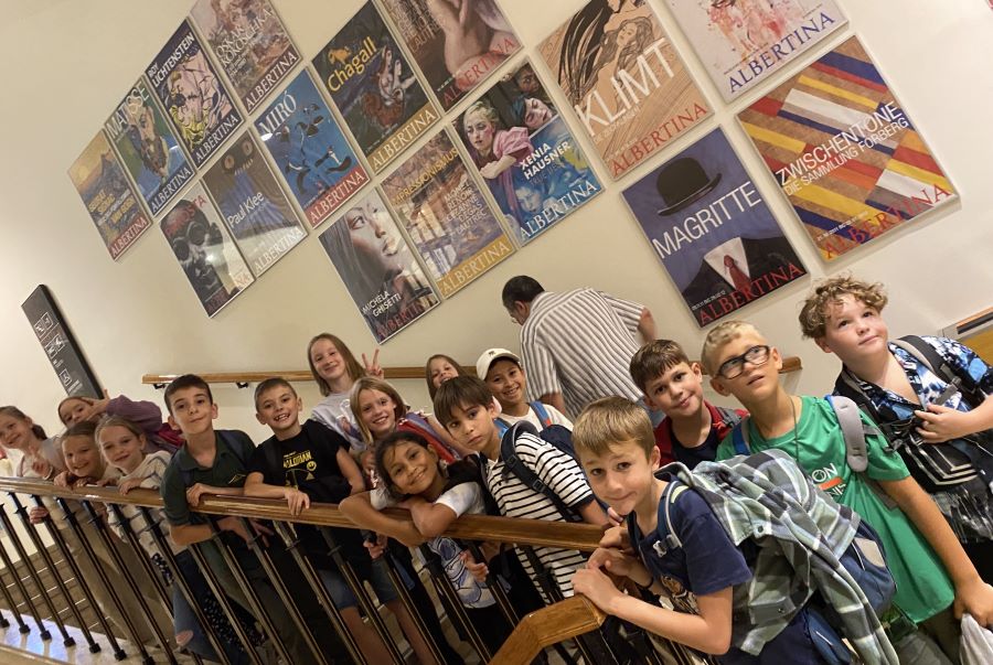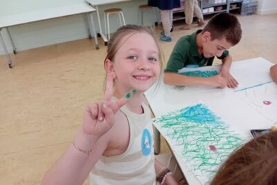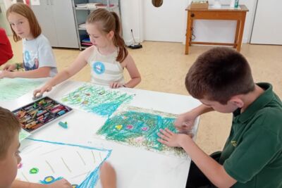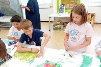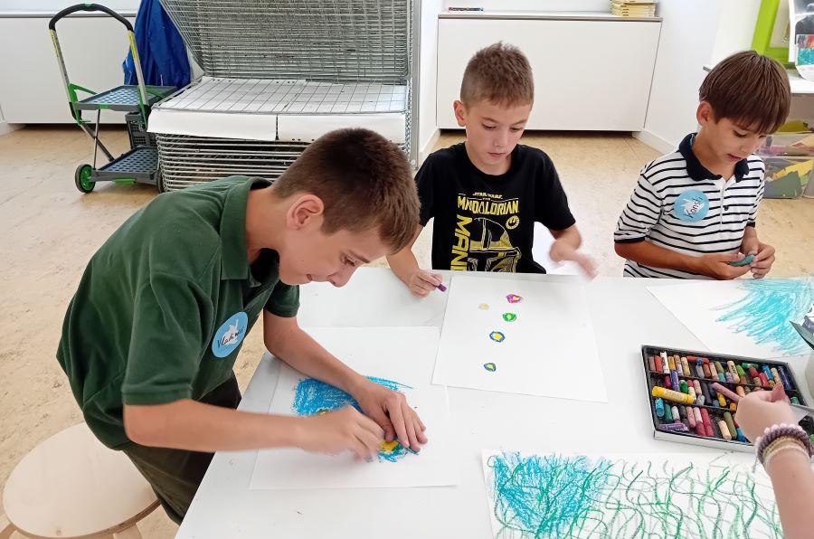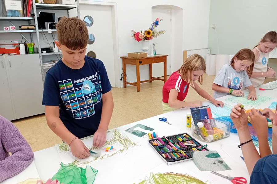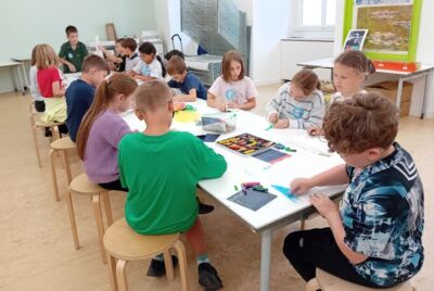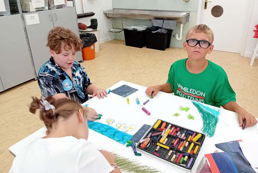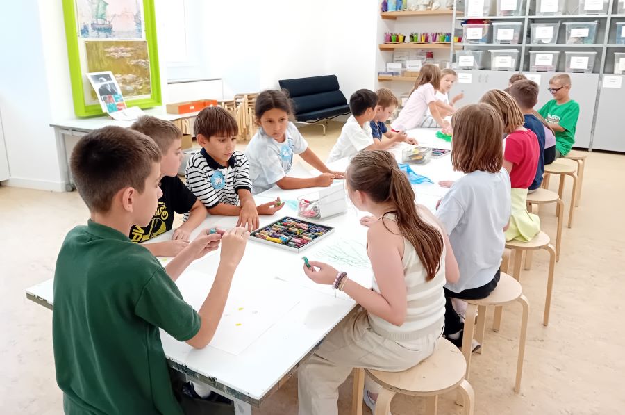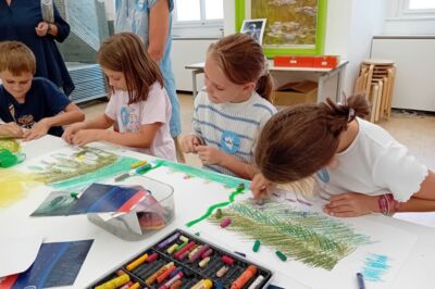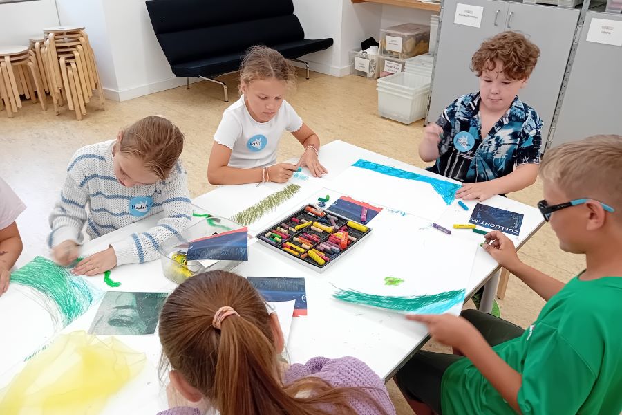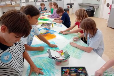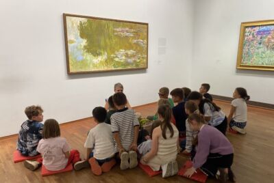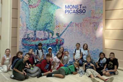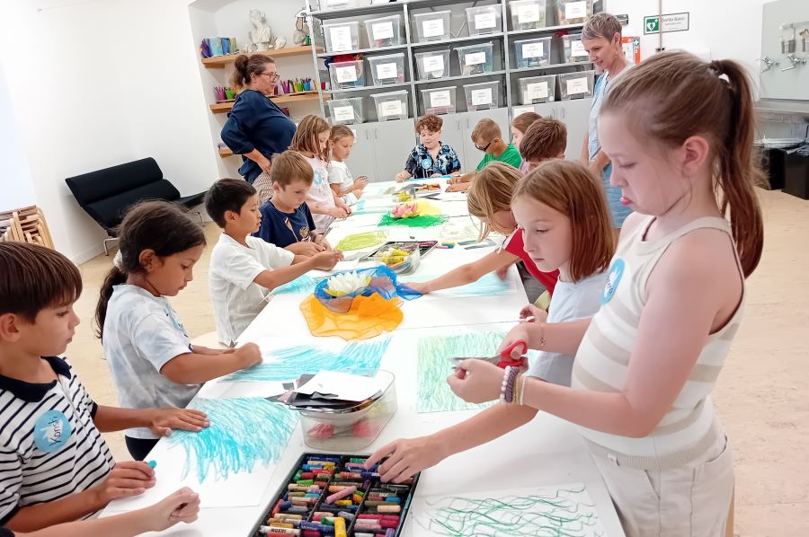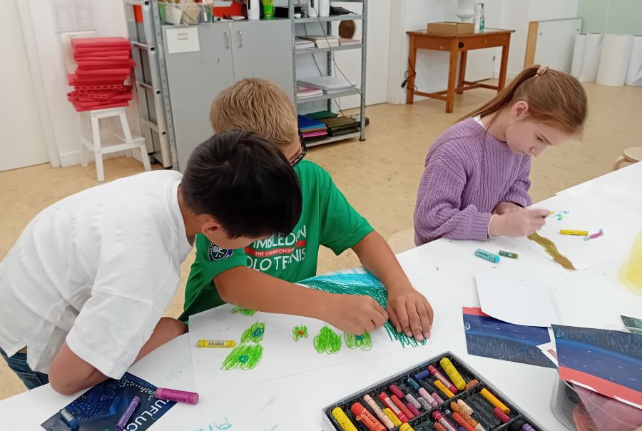 Nach einer Führung durch die Ausstellung Monet bis Picasso durften die Kinder selbst zu Künstlern werden und mit Ölkreiden Monets Seerosenbild nachgestalten.