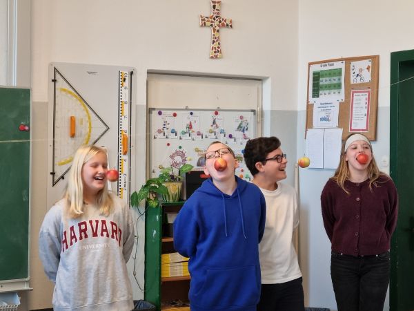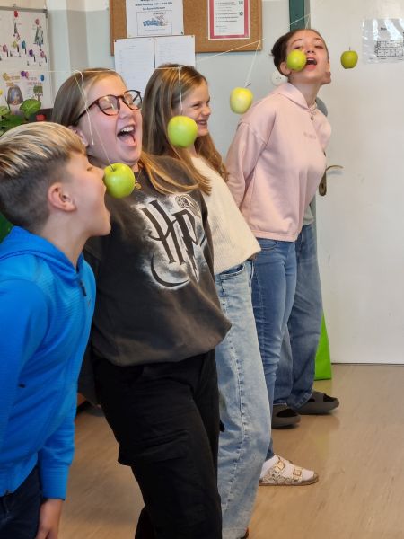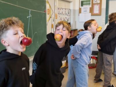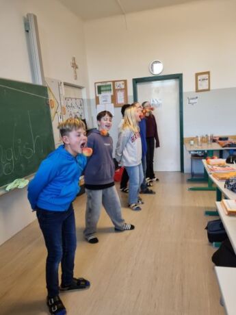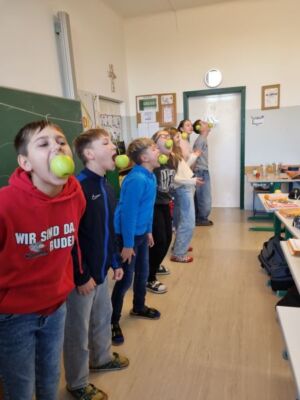 First we read about Halloween traditions in England, then we tried out the game „apples on a string“. We had a lot of fun and the apples tasted delicious.
