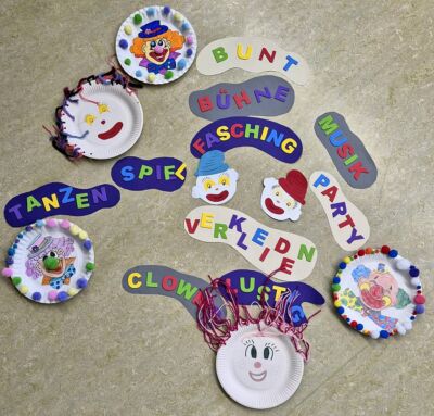 Viele bunte Clowngesichter lachen von der TI-Pinnwand. Unser Bastelspaß kam so richtig in die Gänge, unterstützt durch einen Materialmix aus Pappteller, Moosgummi, Papier und Bommeln.