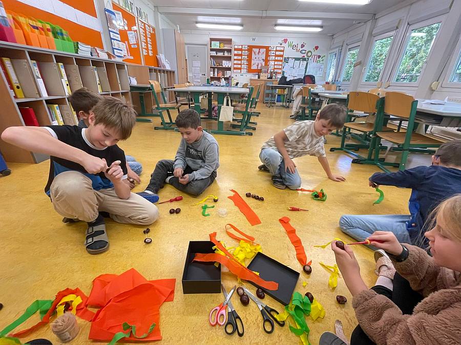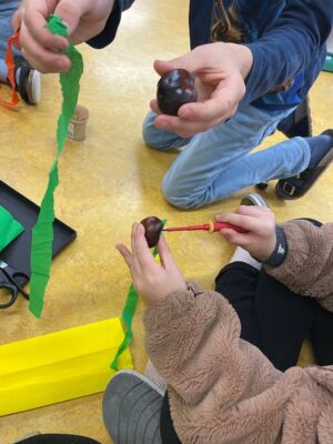 Da in unserem Garten viele Kastanien liegen, sammelten wir (3a) diese fleißig ein. In der Klasse bohrten wir mit Schraubenziehern Löcher hinein und steckten dann Krepppapier hinein. Daraus wurden unsere bunten Kastanienflieger, die wir im Garten gleich ausprobierten.
