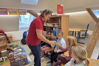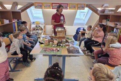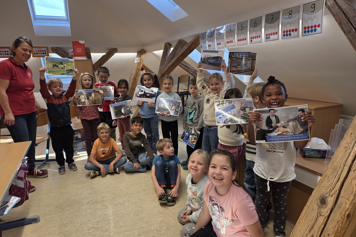 Kürzlich besuchte die 1. Klasse die Seminarbäuerin Sonja Neubauer und nahm die Kinder mit auf eine spannende Reise „vom Stall bis zum Frühstückstisch“. Anschaulich erklärte sie, wie die Milch entsteht, verarbeitet wird und schließlich als Käse, Joghurt oder Butter bei uns auf dem Tisch landet.