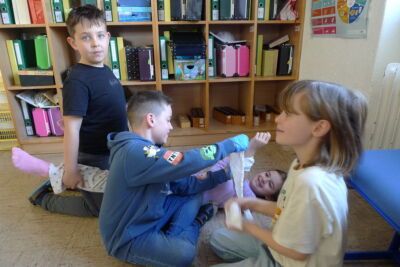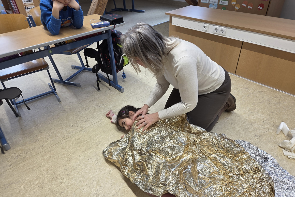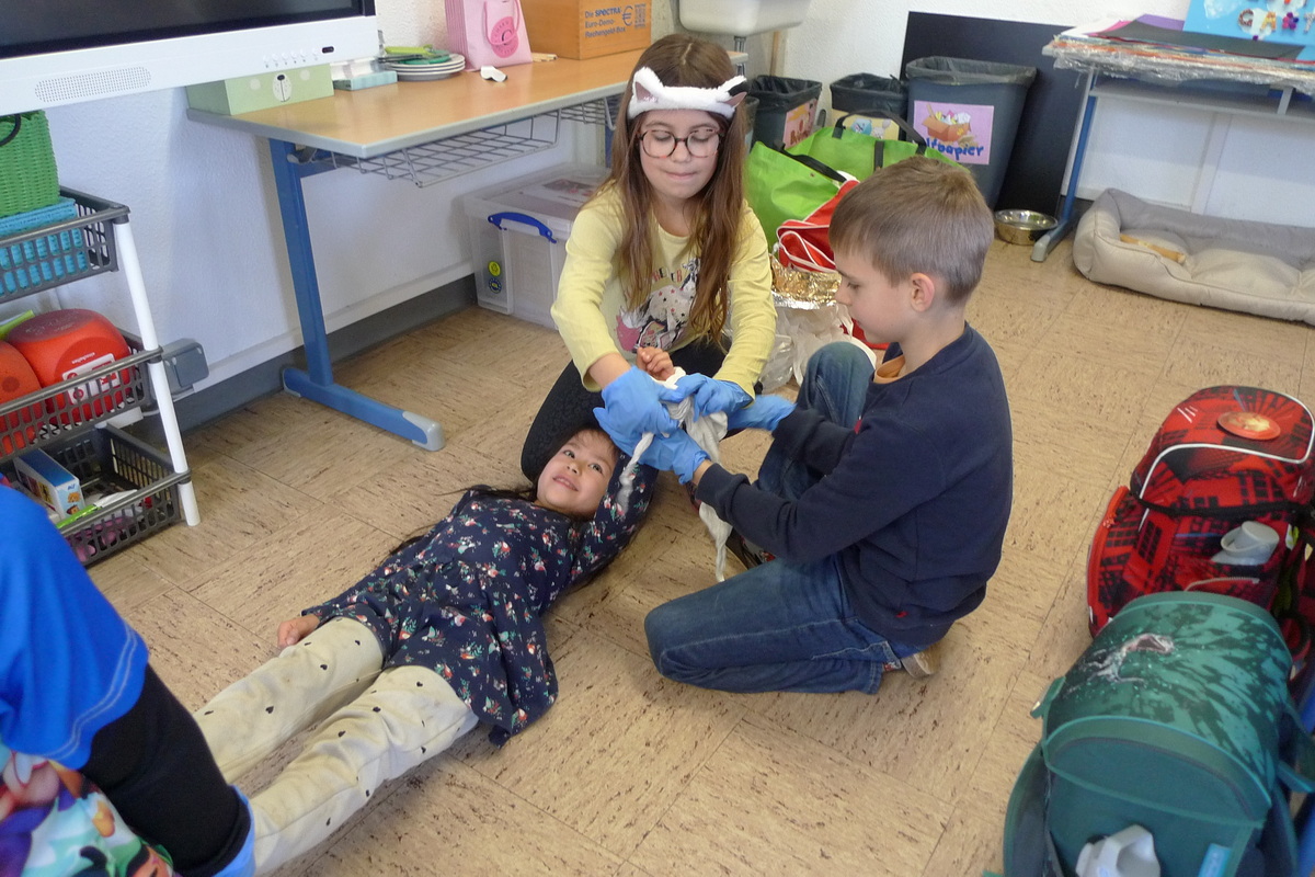 Kindgerecht und anschaulich erklärte die Schulärztin, wie man in unterschiedlichen Situationen richtig reagiert und Hilfe leistet. Die Schülerinnen und Schüler lernten, wie man kleine Wunden versorgt, Pflaster richtig anbringt und einfache Verbände anlegt. Mit großem Interesse und viel Einsatz wurde das Gelernte auch praktisch geübt.