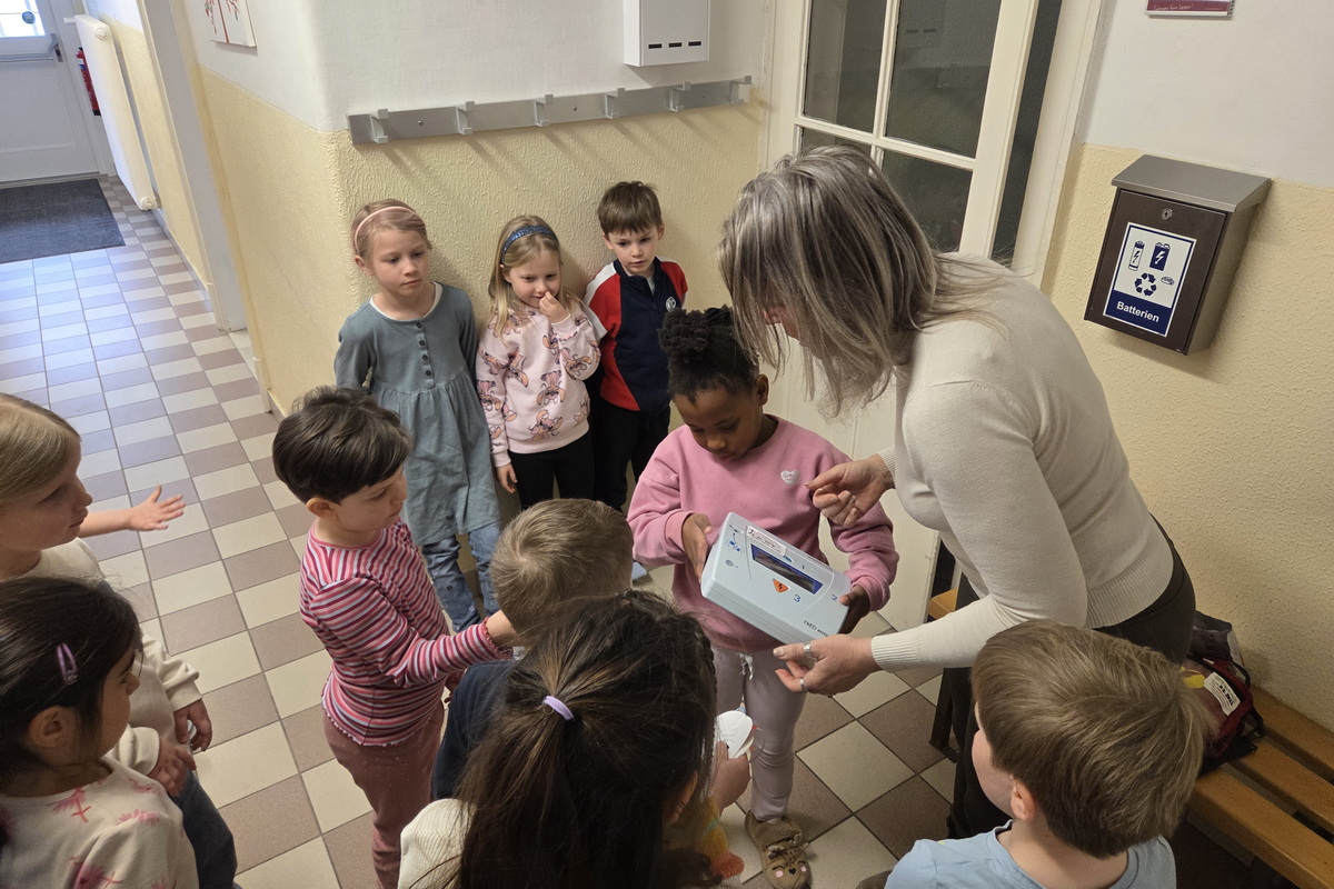 Ein besonderes Highlight war die Einführung in den Umgang mit dem Defibrillator. Die Kinder erfuhren, wie dieses wichtige Gerät funktioniert und dass man im Notfall keine Angst haben muss, es zu benutzen.