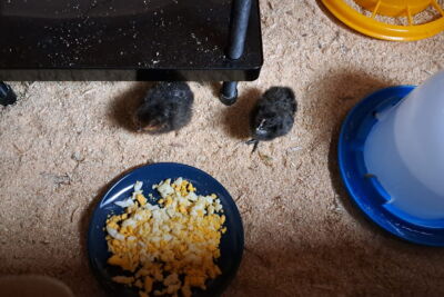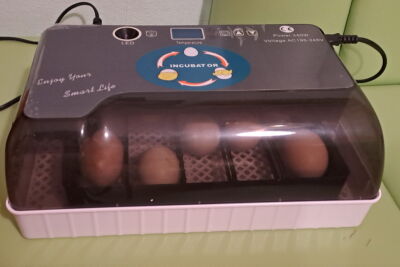 21 Tage lang mussten wir uns gedulden. Hühnereier verschiedenster Rassen (Seidenhühner, Strupphühner, …) wurden im Brutkasten gehegt und gepflegt. Die Temperatur und Luftfeuchtigkeit mussten passen und die Eier mussten auch gewendet werden. Zwischendurch wurden sie geschiert. So konnten wir erkennen, ob sie befruchtet waren.
