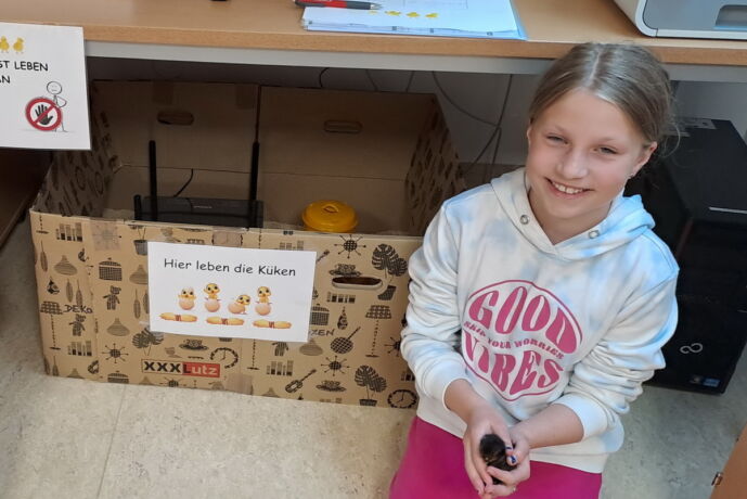 Wirklich aufregend wurde es dann, als die Kleinen endlich schlüpften. Wir konnten es kaum glauben. Nun wuseln 5 kleine Küken in ihrem vorübergehenden Zuhause in der Schule herum.