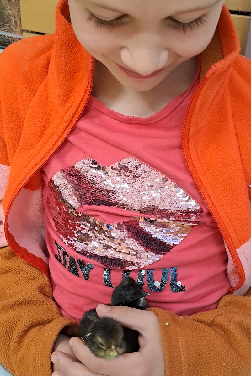 Sie werden noch liebevoll betreut und behütet bis sie groß genug sind, um in den Hühnerstall ihrer Eltern einzuziehen.