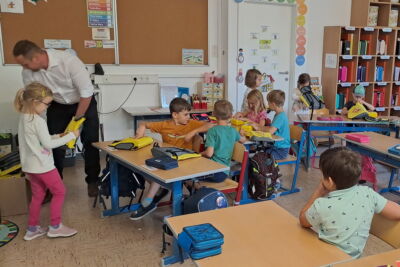 Herr Klinglmüller von der Raiffeisenbank Lanzenkirchen wünschte allen einen guten Schulstart!