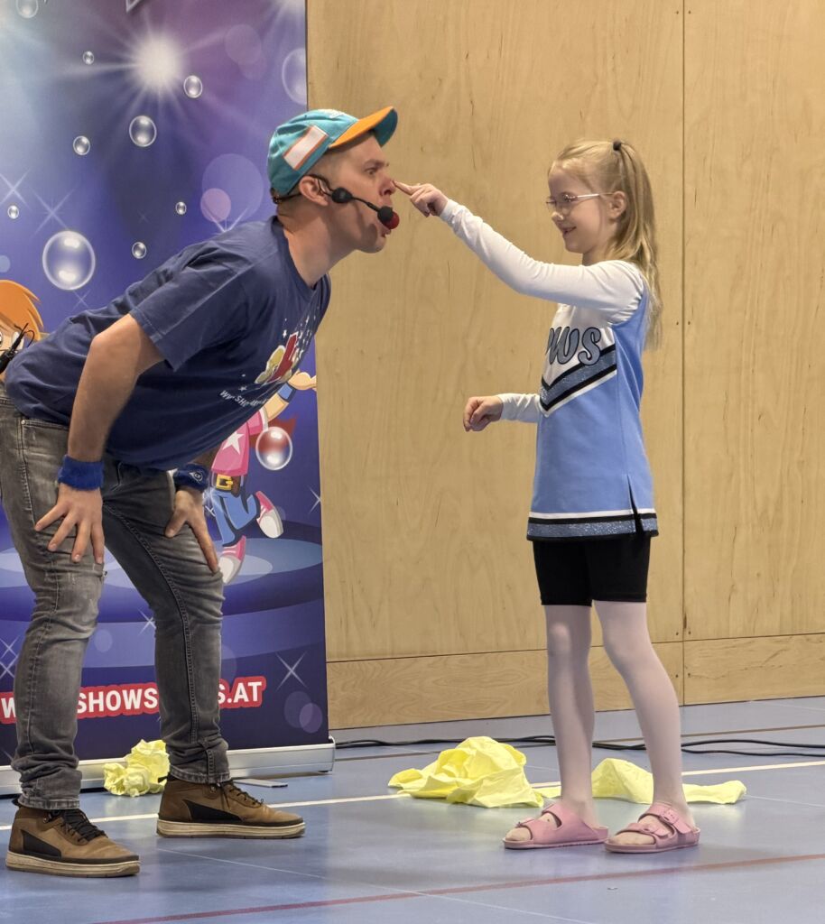 In den Klassen wurde gespielt, gelacht und gemeinsam gefeiert. Verschiedene Stationen mit Spielen, Musik und Bewegung luden zum Mitmachen ein. Ein besonderes Highlight war die Mitmachshow mit Kurt, die den Kindern großen Spaß machte. Mit viel Humor, Musik und Action begeisterte er das junge Publikum und sorgte für viele lachende Gesichter.