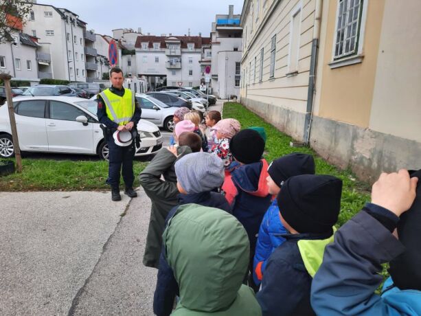Passend zum Schulanfang und zur Verkehrserziehung erforschten wir die Kreuzungen um unsere Schule und übten das richtige Überqueren. Dabei bekamen wir Hilfe und Anleitung durch einen netten Polizisten.