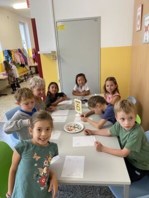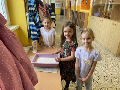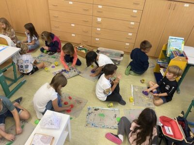 Unseren 1. Buchstaben übten wir mit Hilfe unserer Leseomi und Schwester Nicole an vielen tollen Stationen. Wir klebten mit bunten Klebebändern, wir stempelten, wir formten aus Plastilin, wir kosteten Soletti, schrieben im Sand, steckten mit Steckperlen und übten auch fleißig im Buchstabenheft. So macht Buchstaben lernen Spaß!