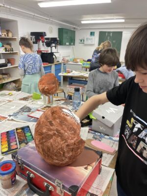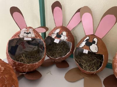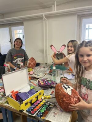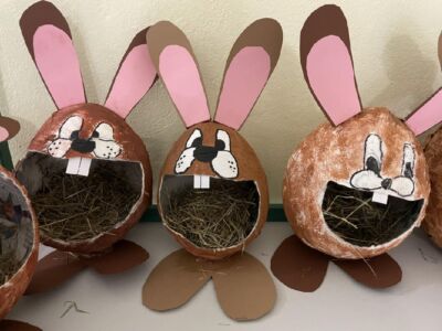 Die Klasse 4a ist bereits voller Vorfreude auf das bevorstehende Osterfest! Mit viel Begeisterung und Kreativität wird fleißig gebastelt. Die Kinder gestalten aus Pappmaché Osternester in fröhlicher Hasenform.