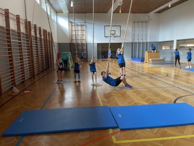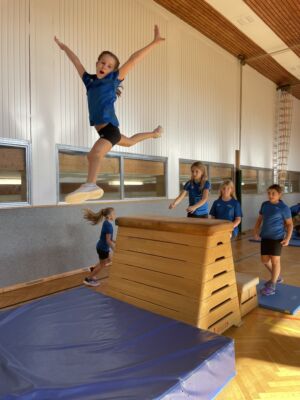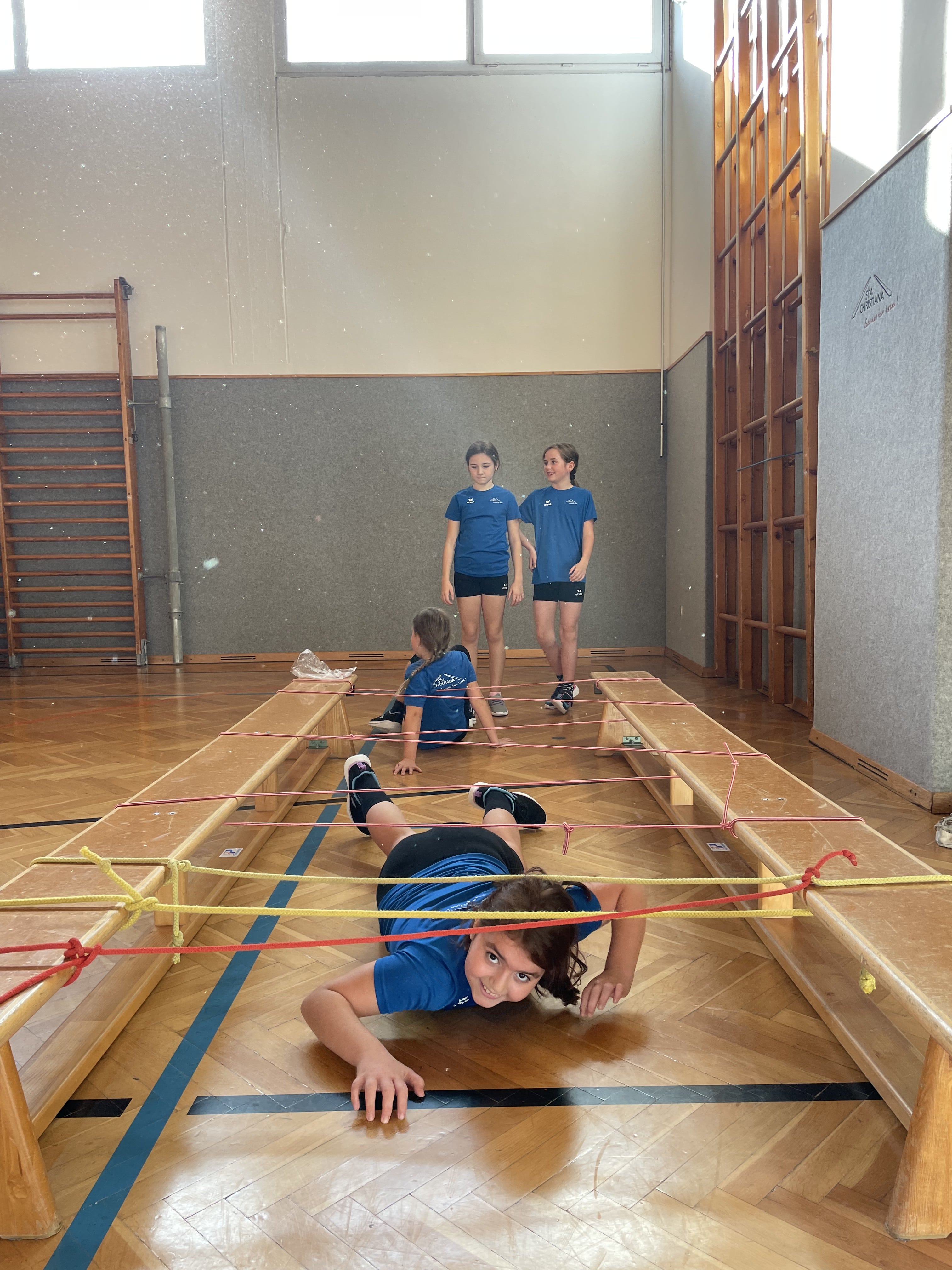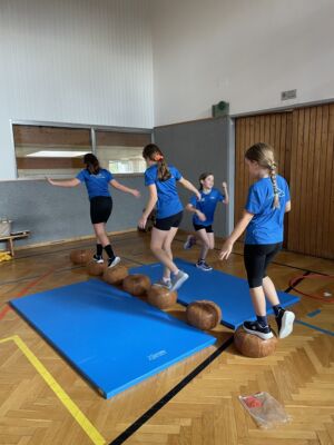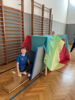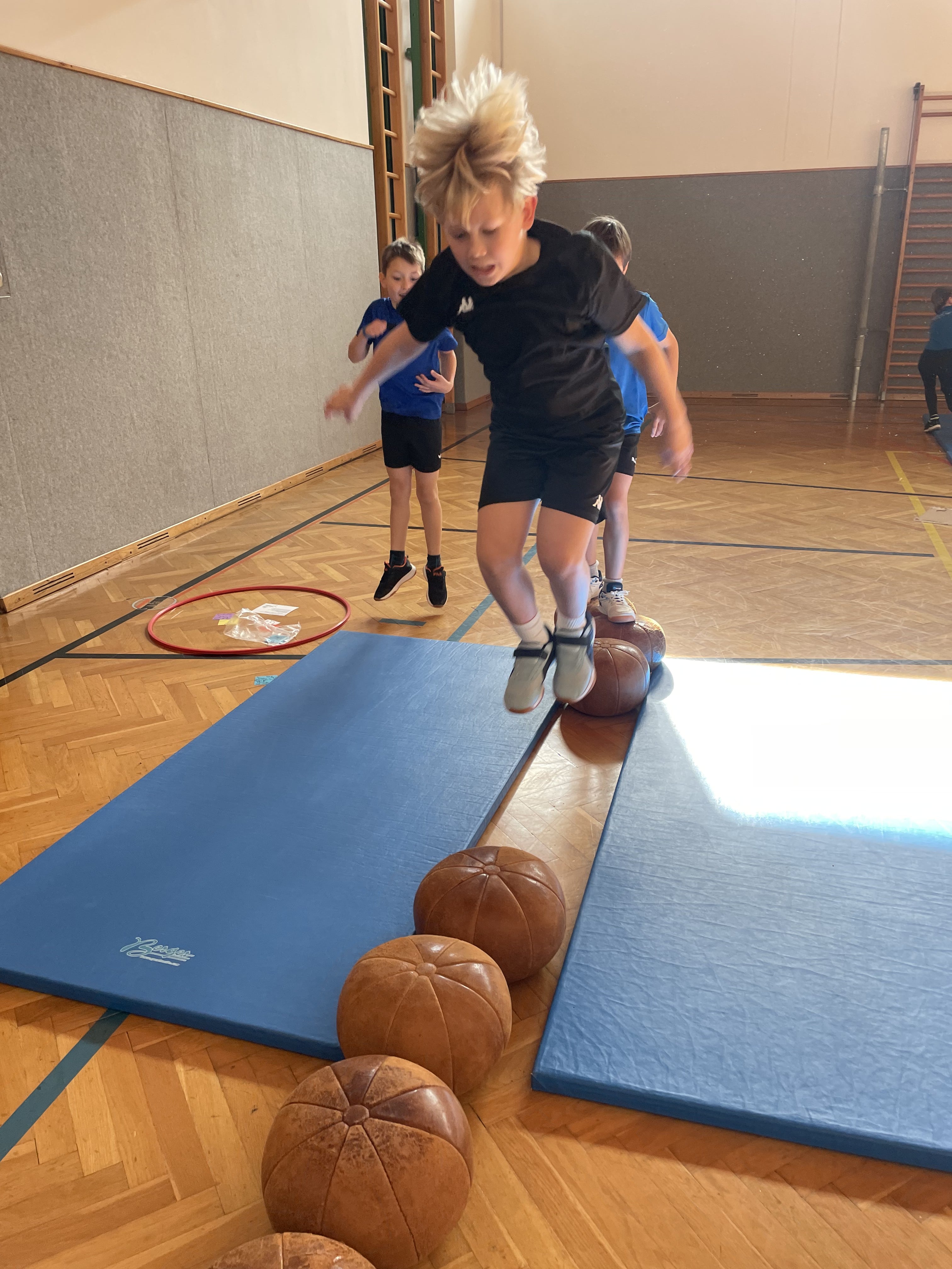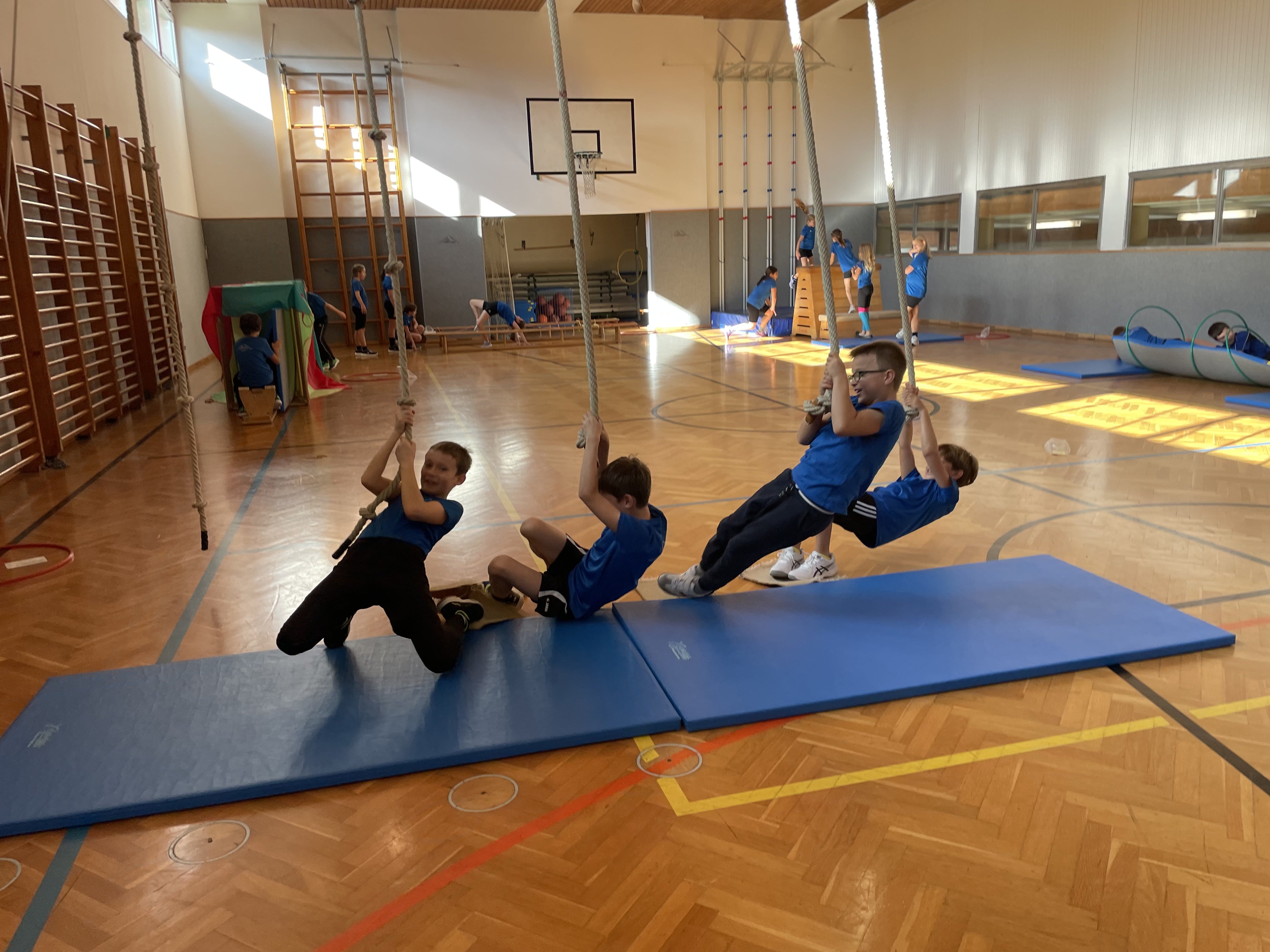 Im vielseitigen Bewegungsparcours ist die 4a voller Energie unterwegs. Die Kinder klettern, balancieren, springen und laufen durch verschiedene Stationen und entdecken dabei immer neue Herausforderungen. Mit Freude, Mut und viel Teamgeist meistern sie jede Aufgabe. Der Spaß an der Bewegung steht dabei klar im Mittelpunkt.