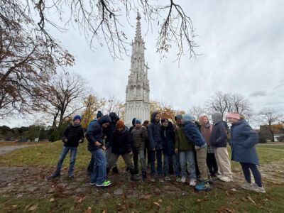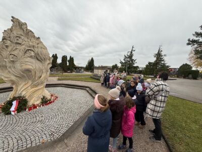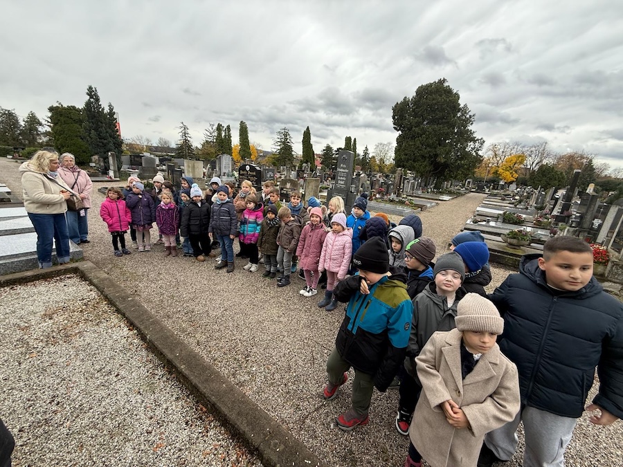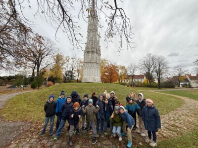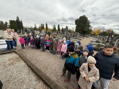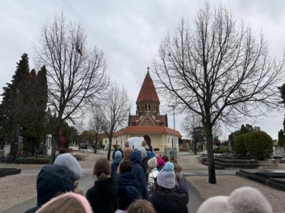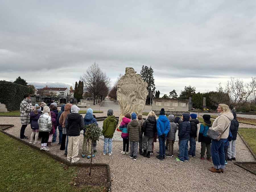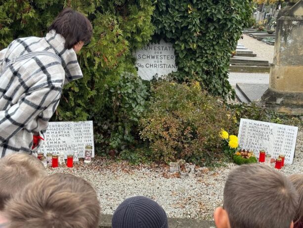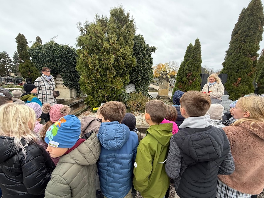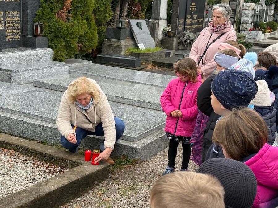 Am Montag machten die Kinder mit ihrer Partnerklasse einen Ausflug zum Friedhof. Dort wurde ihnen das Grab der Schwestern von Sta. Christiana gezeigt und von Frau Passuello – Kuchaz einiges dazu erzählt. Auch die Kapelle, die Ehrengräber und das Kriegerdenkmal konnten sie sehen. Am Rückweg besuchte die 3a auch noch die „Spinnerin am Kreuz“.