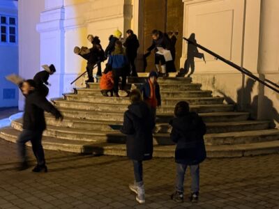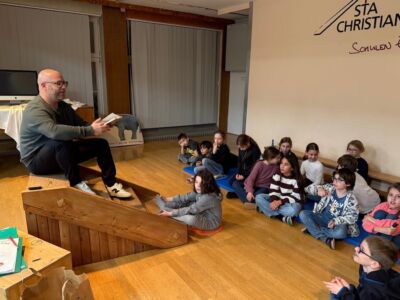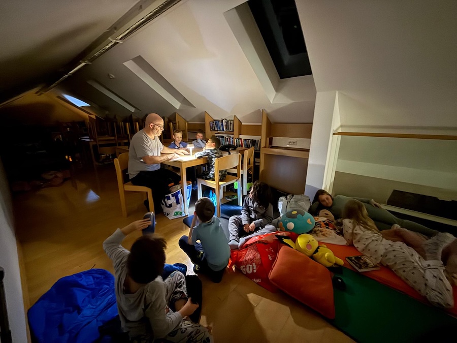 Die eigentliche Lesenacht begann auf der Bühne im Speisesaal und im „grünen Saal“ im Keller der Schule – dort lasen wir aus dem Buch „Die magische Lesenacht“ vor. Danach ging es zurück in die Bibliothek. In den Schlafsäcken wurde gemütlich mit Taschenlampen weitergelesen.